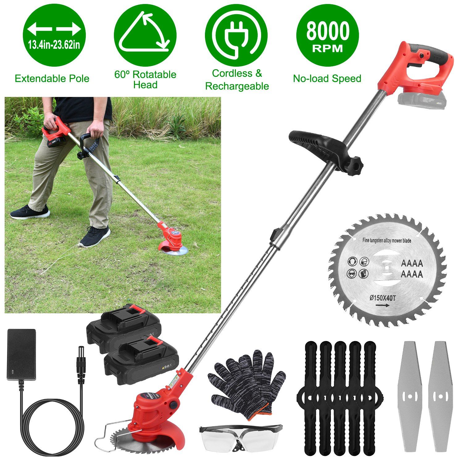 Cordless & Rechargeable: Provides 2 packs 1500mAh rechargeable batteries and 1 adapter for portable charging. After fully charged, our grass trimmer is convenient to use with no more cumbersome wiring, no more messy. It is unlimited restraint, free movement, flexible, easy to use.