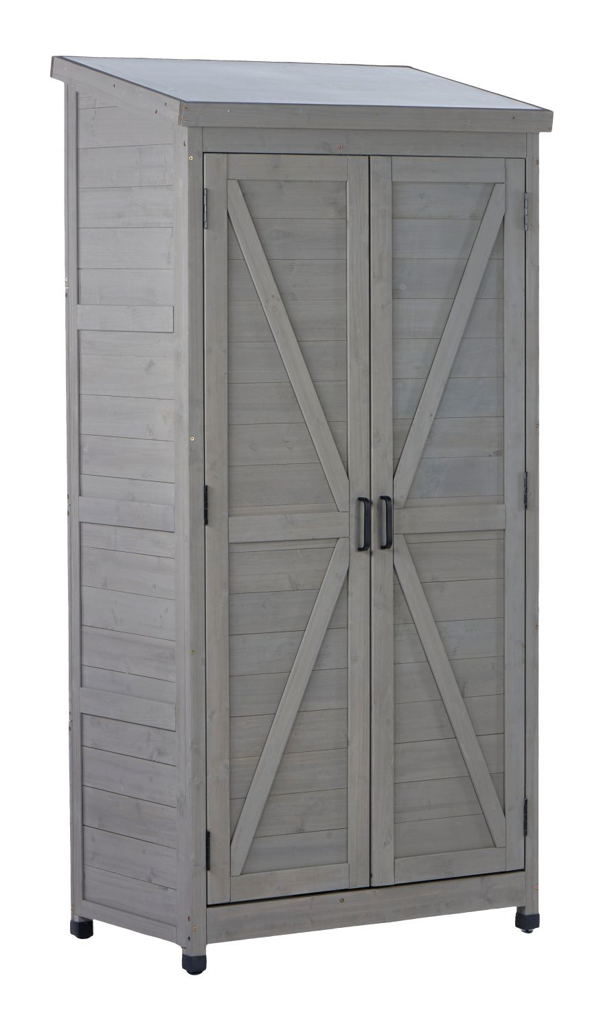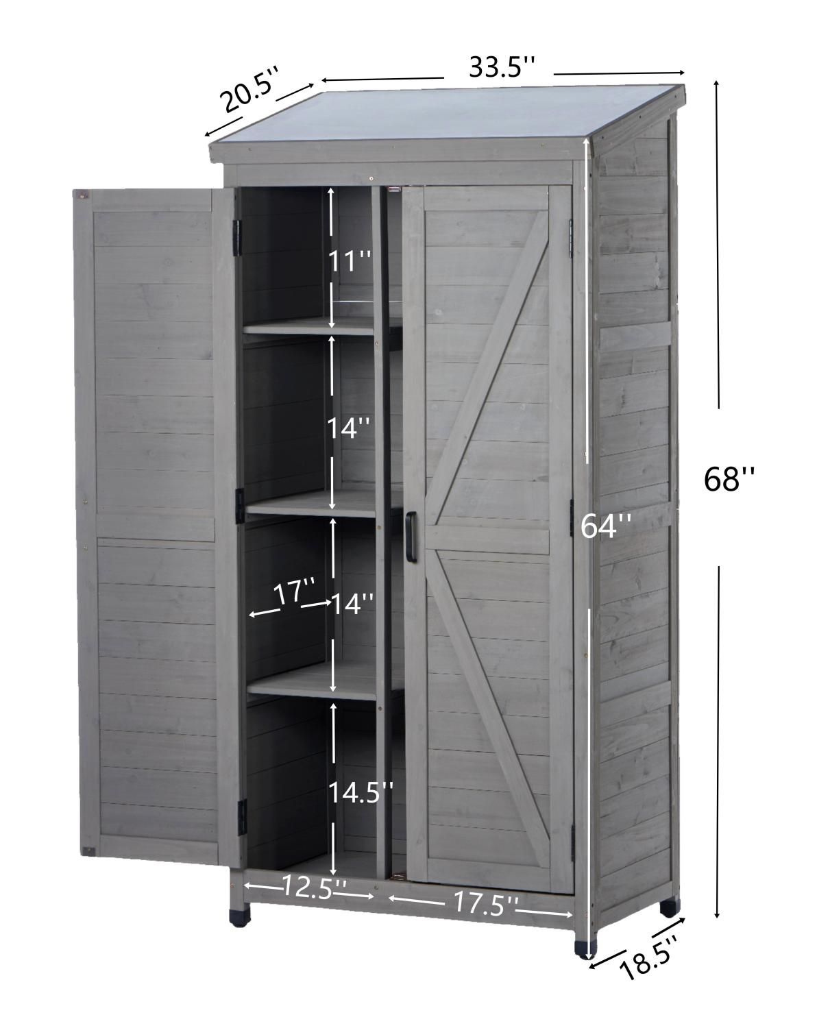 Patented Farmhouse Design: Vertical Tool Shed made of premium cedar wood with water-based gray coating to protect the garden storage shed from bad weather, rain, sunlight, and water accumulation. featuring a patented farmhouse design for classic style.