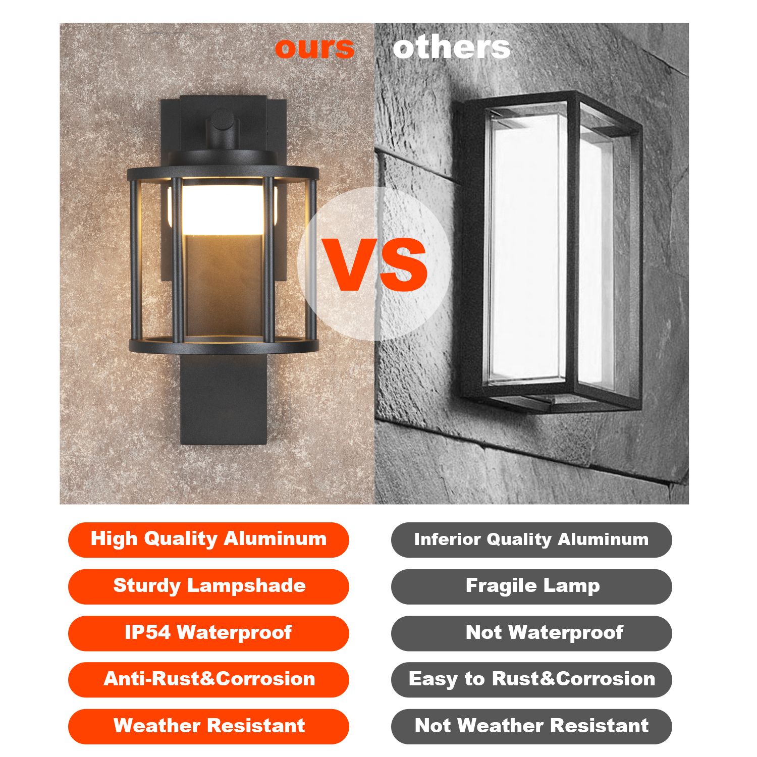 3.Weather Resistant & Durable:Our outdoor wall sconce is IP44 grade waterproof and durable enough to withstand any weather changes, The outdoor wall lantern is constructed with high quality aluminum which effectively prevent from rustiness or corrosion, ideal for any outdoor environment . Even it is rain, snow, ultra-high or low temperatures, this outdoor wall lamp will always remain bright and new. Ideal for entryway, doorway, foyer, corridor, balcony, patio and porch.